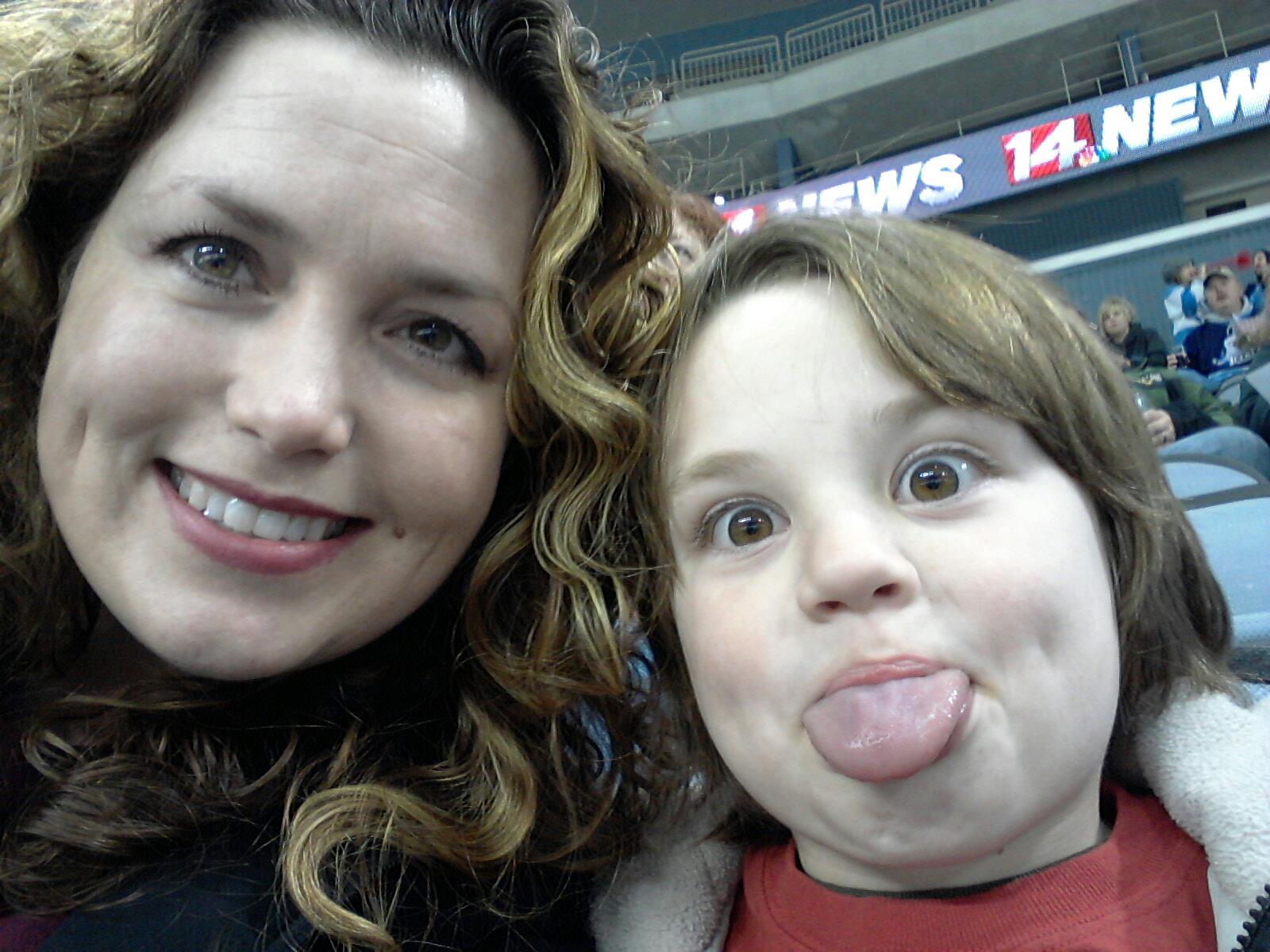 Pfffttttt! My kid, he’s just like me. I am usually making silly faces too, but these days I try not show off the triple chin or wrinkles that are multiplying! Here we are at our very first hockey game. Our local team, the Icemen, won 6 to 1! It was fun and not as cold as I thought it would be. I have to say, I don’t quite get all the fighting though. Too much testosterone I guess.