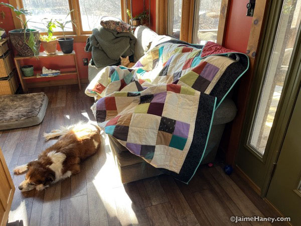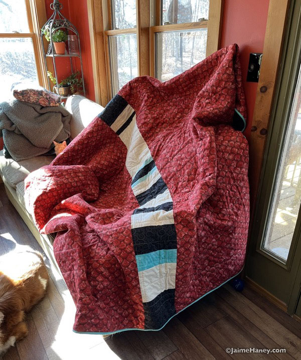 A couple of weeks have gone by now and he’s had time to use the quilt. He has admitted to me that he likes it. That’s some consolation.