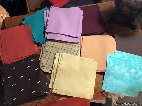 Below you can see I found a replacement. The turquoise mottled fat quarter worked out nicely I thought. It helped to lighten up the quilt, too. I ended up needing more than one fat quarter and when I went back to get more fabric more than a year later, of course it wasn’t there. So I got one close.