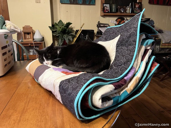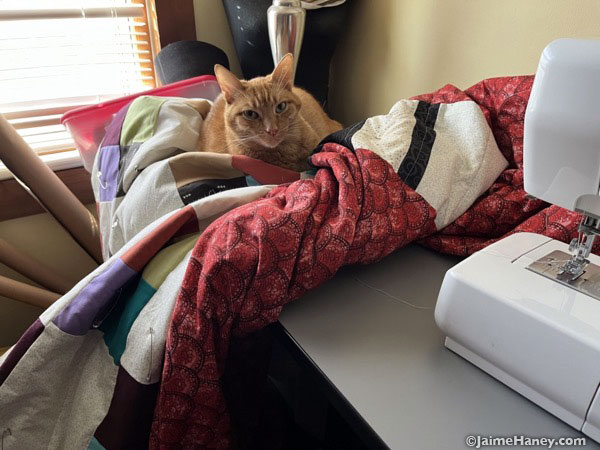 Alright before I get too nostalgic, there’s still lots of work to be done. Loki, my son’s orange cat, loves the quilt. I would find him asleep on it every time I went into my sewing room to work on it. As you can tell, he doesn’t see a problem with that. Here I’ve already quilted about a quarter of it. I did it with my own machine stitch in the ditch style.