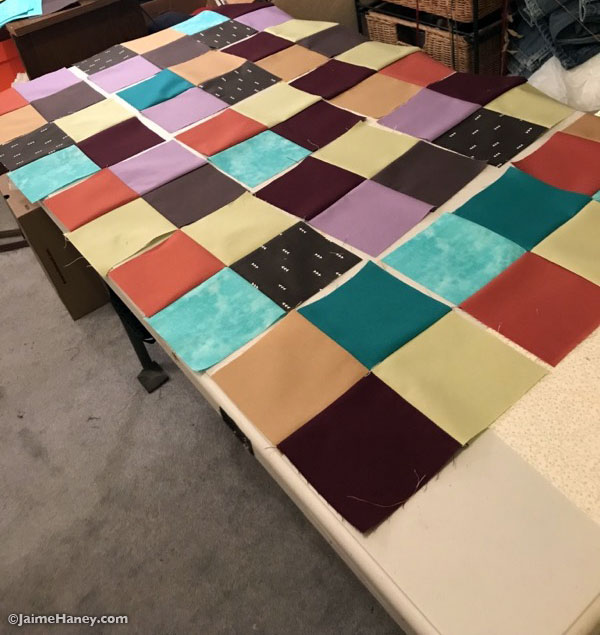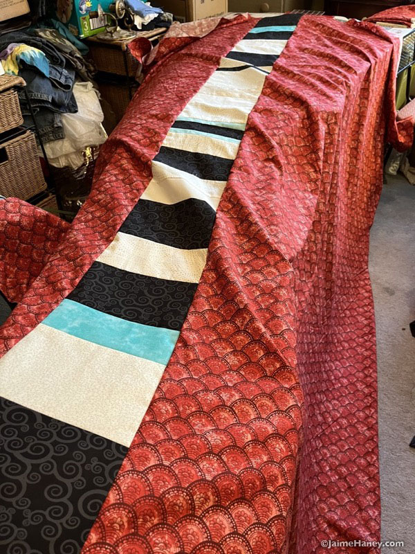 After adding the fancy borders, I wanted to make the back a little more finely designed than I first planned. Originally, I had planned to just have one fabric pieced together to span the entire backside. Below is what I ended up doing. I learned this from yet another YouTube video, I’m pretty happy with how it turned out. Much more graphic looking, which I really like.
