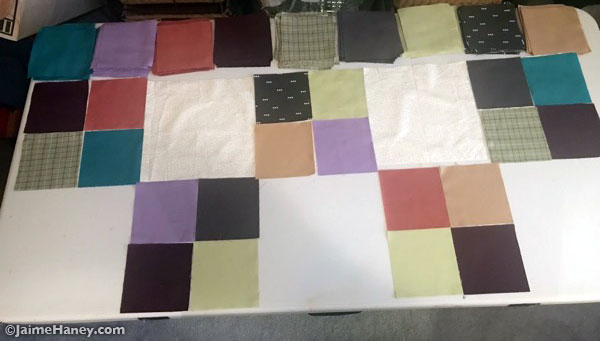 Above, the photo shows my attempt at piecing together colors. I was trying to envision how it might look and what colors combinations to use together. Remember this was for my dad, so I didn’t want it to be too girly looking. Using the 4 patch method (I think) was the plan. The plaid green square though just wasn’t looking good to me though, so I scrapped those. But I wanted another pattern to take it’s place. In my mind I had a color scheme.
