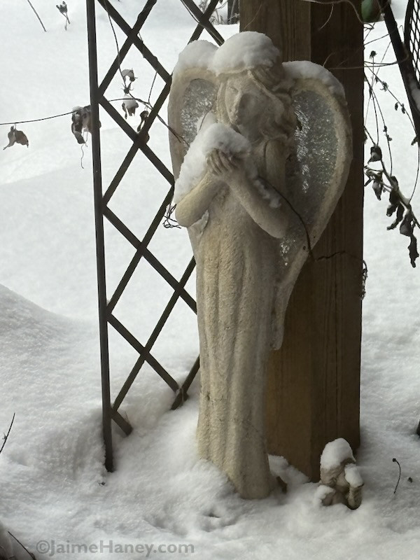 My favorite angel statue holding a little bird is below. You can’t see the little bird though because it’s covered in snow. These statues are under my deck believe it or not! The wind blew the snow in. It’s much deeper in the open area. In fact, you can’t even see the koi fish pond in the background.