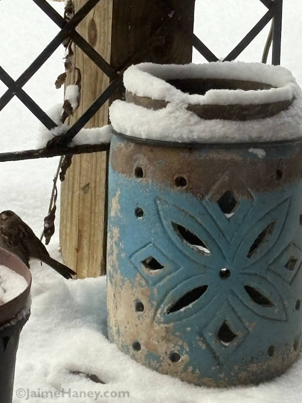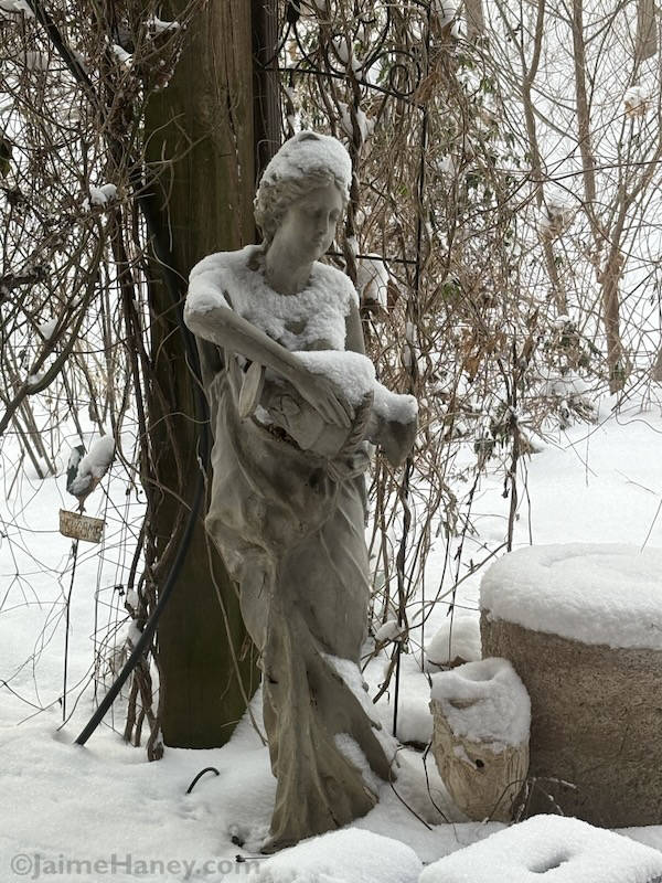 Meanwhile, in Studio Gardens, the snow has a way of making it look just magical. Below, is my new to me lady statue that my friend Kelly gave me. It’s extra special because it was given to her by a mutual friend of ours, Jane, who we sadly lost suddenly last fall. I’ll forever think of Jane now every time I look at this statue.