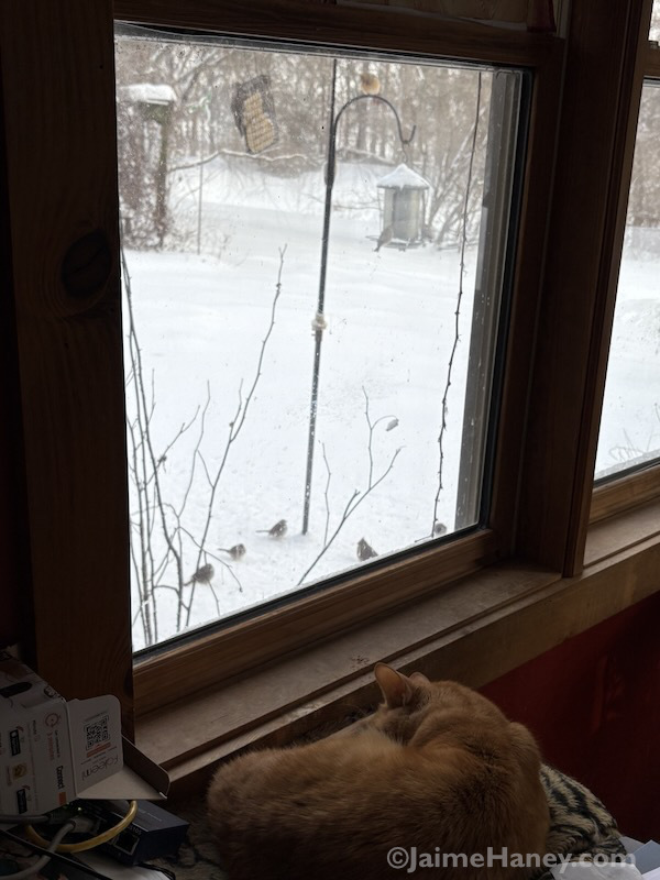 My birds are eating the seed like crazy. I’ve been refilling it and the suet a few times. Below is Loki, wore out from watching Cat TV. haha… the birds are oblivious, happily munching away and being so considerate waiting their turn. I love watching the birds. They are inspiration for some of my paintings. Oh and just so you know, you can click the link without any commitment to buying the products. Just go look, it’s so cool!